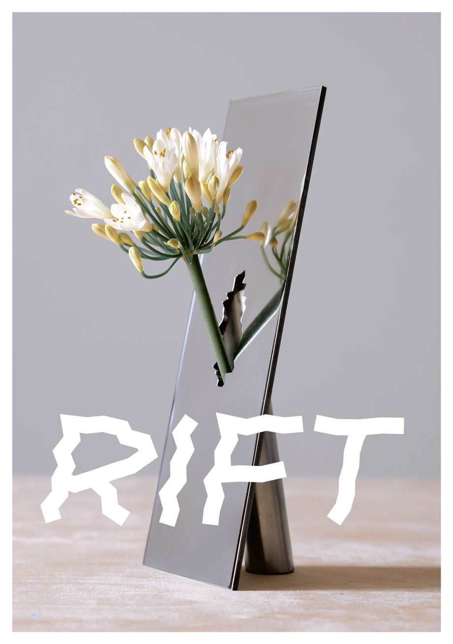 Rift is a vase made from polished stainless steel. A narrow crack opens the surface of the metal. A flower placed inside appears to emerge through this rupture, while the mirrored steel reflects and multiplies petals and light. The angled geometry of the form introduces tension to the object. Within the polished metal, nature and technology meet. The flower appears to have pushed through the steel, suggesting a quiet image of organic growth overcoming a technical material.